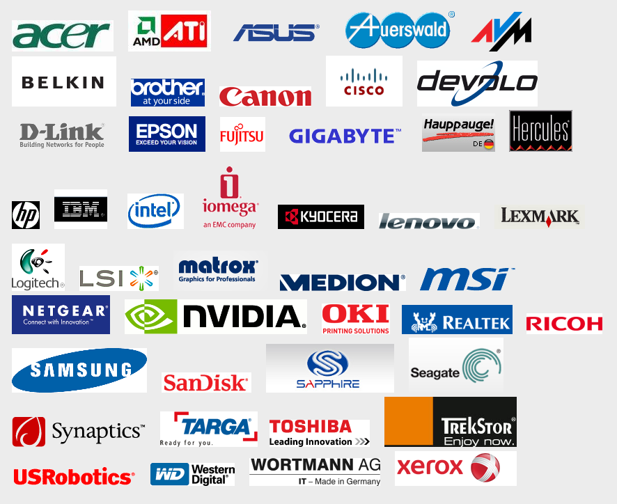 Sie suchen nach einem passenden Treiber? Hier finden Sie die direkten Links zu den bekanntesten Herstellern. Wir bemühen uns, diese Seite immer so aktuell wie möglich zu halten. Sollte mal ein Link nicht funktionieren, dann informieren Sie uns bitte über unser Kontaktformular. Klicken Sie auf das jeweilige Logo, um zum Treiber-Support zu gelangen.